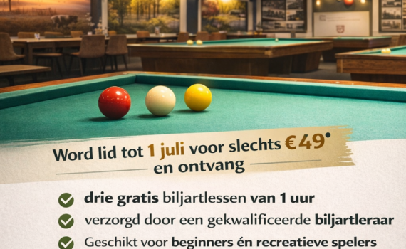 Biljartvereniging Carambole Rumpt is bij uitstek dé plek om samen te komen en het biljartspel te leren of verder te ontwikkelen. Of u nu beginner bent of recreatief biljart, bij ons bent u van harte welkom. Word nu lid en profiteer van een aantrekkelijke instapactie:👉 Lidmaatschap tot 1 juli voor […]